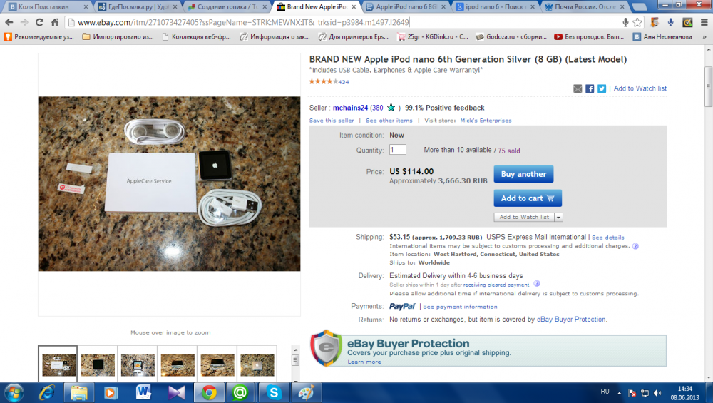 ..PS: До этой покупки был один неприятный инцидент. Мы заказали iPod nano 6 для моего первого друга. Посылка шла очень долго и мы вели переписку с продавцом по этому поводу. через месяц оказалось, что все что было внутри посылки украли. Мы написали продавцу и спросили, что делать по этому поводу. Он сказал что отправит новую посылку в более прочной коробке и застрахует её. Буквально вчера он прислал нам номер отслеживания)) Один «камень» с души свалилися) Теперь будем ждать когда она придёт)… По этому поводу хочу сказать, что продавцы с eBay всегда идут на встречу своим покупателям… Если что то произойдёт с вашим товаром, они всегда вам помогут)