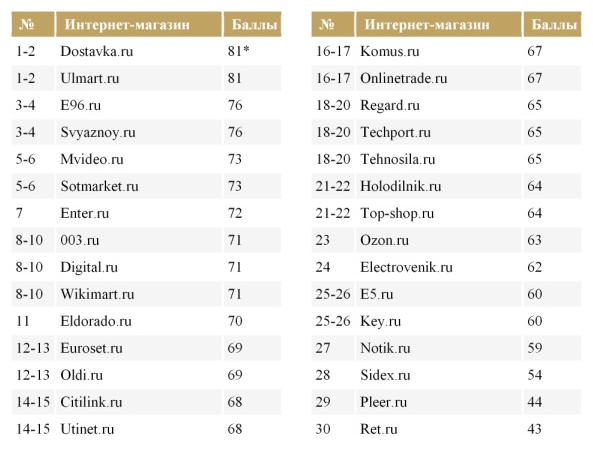 Эффективность измерялась по 100-бальной шкале, и как вы можете видеть, ни один из самых популярных интернет-магазинов России не получил высшей оценки. Значит, есть к чему стремиться.