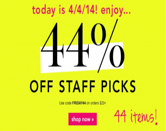 В магазине косметике ELF скидка 44% на 44 позиции по коду FRIDAY44. Покупка должна быть на сумму больше $20. Акция действует только 4.04.2014!