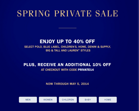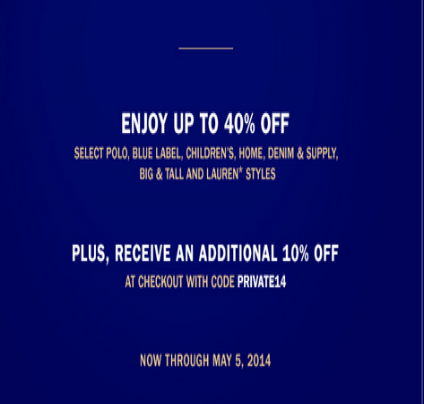 На сайте Ralph Lauren скидки до 40 % плюс скидка 10 % по коду PRIVATE14, действуют до 5 мая!