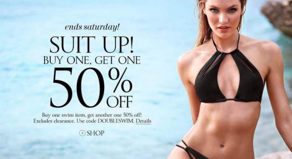 На Victorias Secret cкидка 50 % на вторую часть купального костюма, что стоит меньшую сумму. Предложение действует до субботы.