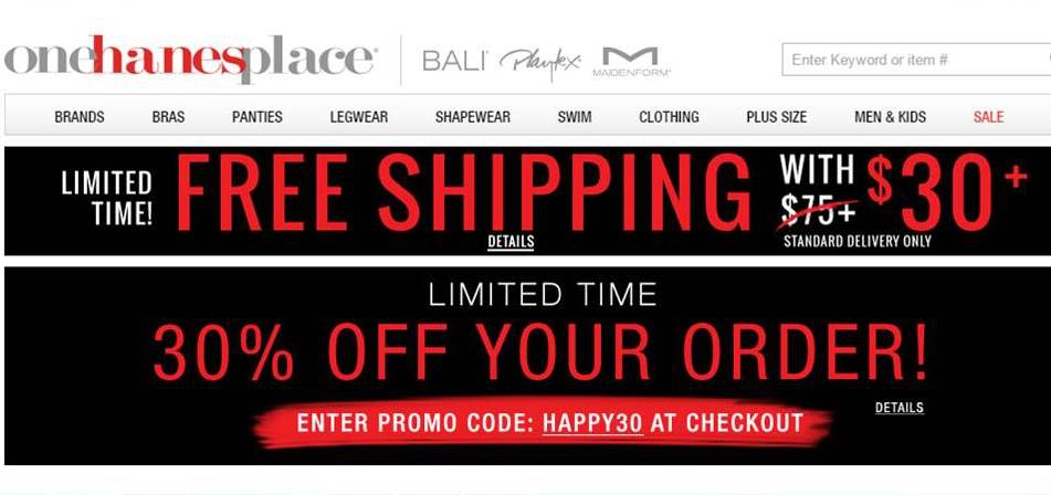 Скидка 30% на весь ассортимент одежды, обуви, аксессуаров для женщин, мужчин и детей на one hanes place. Код скидки: HAPPY30